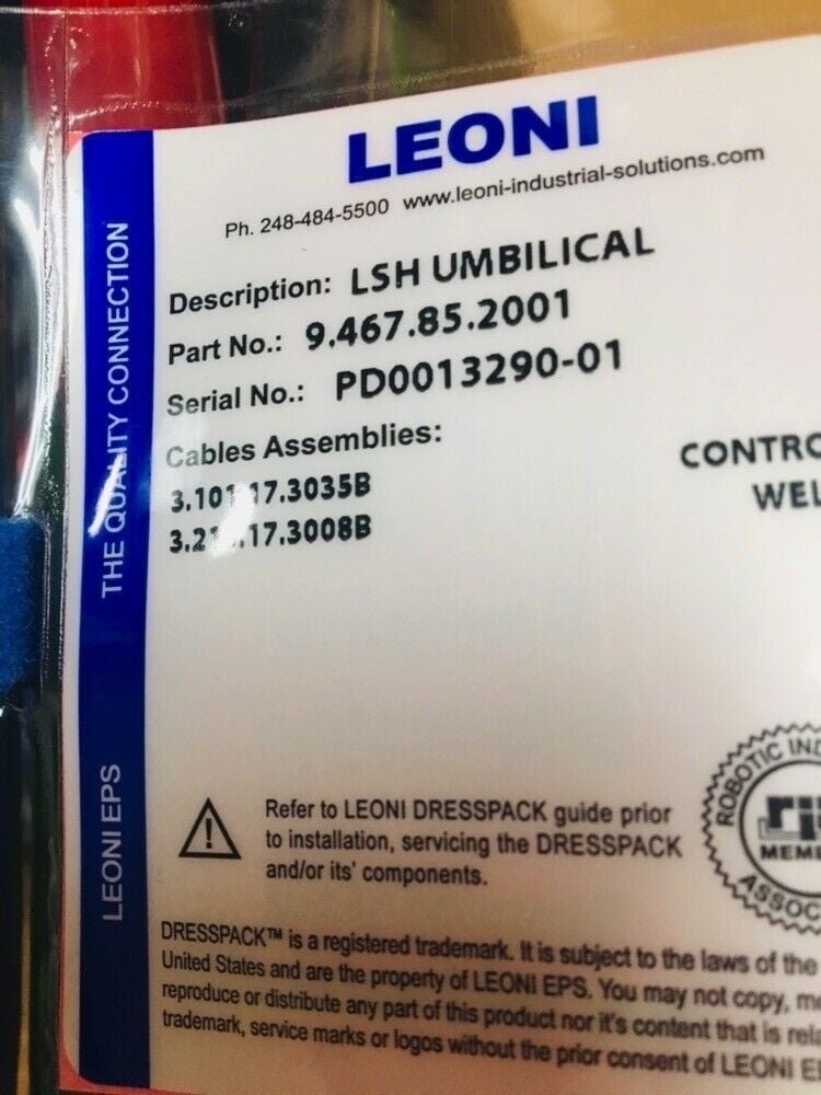 New | LEONI 9.467.85.2001 LSH ROBOT UMBILICAL CABLE DRESSPACK CONTROL & WELDING.